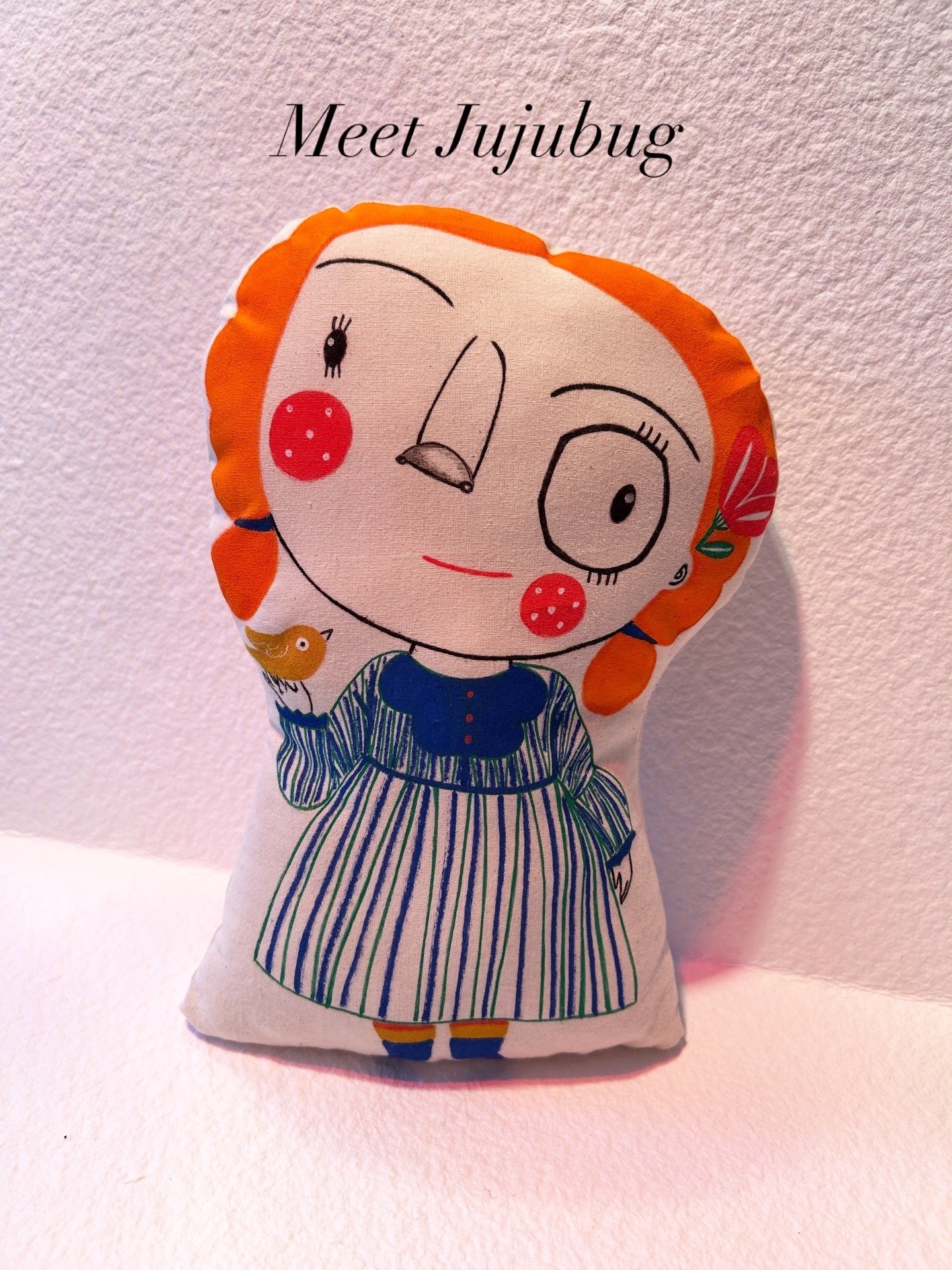 Made from 100% cotton muslin and meticulously hand-painted with Posca markers, she measures 11 inches long and 5.5 inches wide, making her the perfect charming companion.